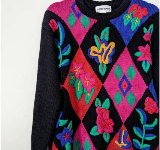 Vintage 80s 90s Argyle Floral Black Multicolor Pullover Sweater
