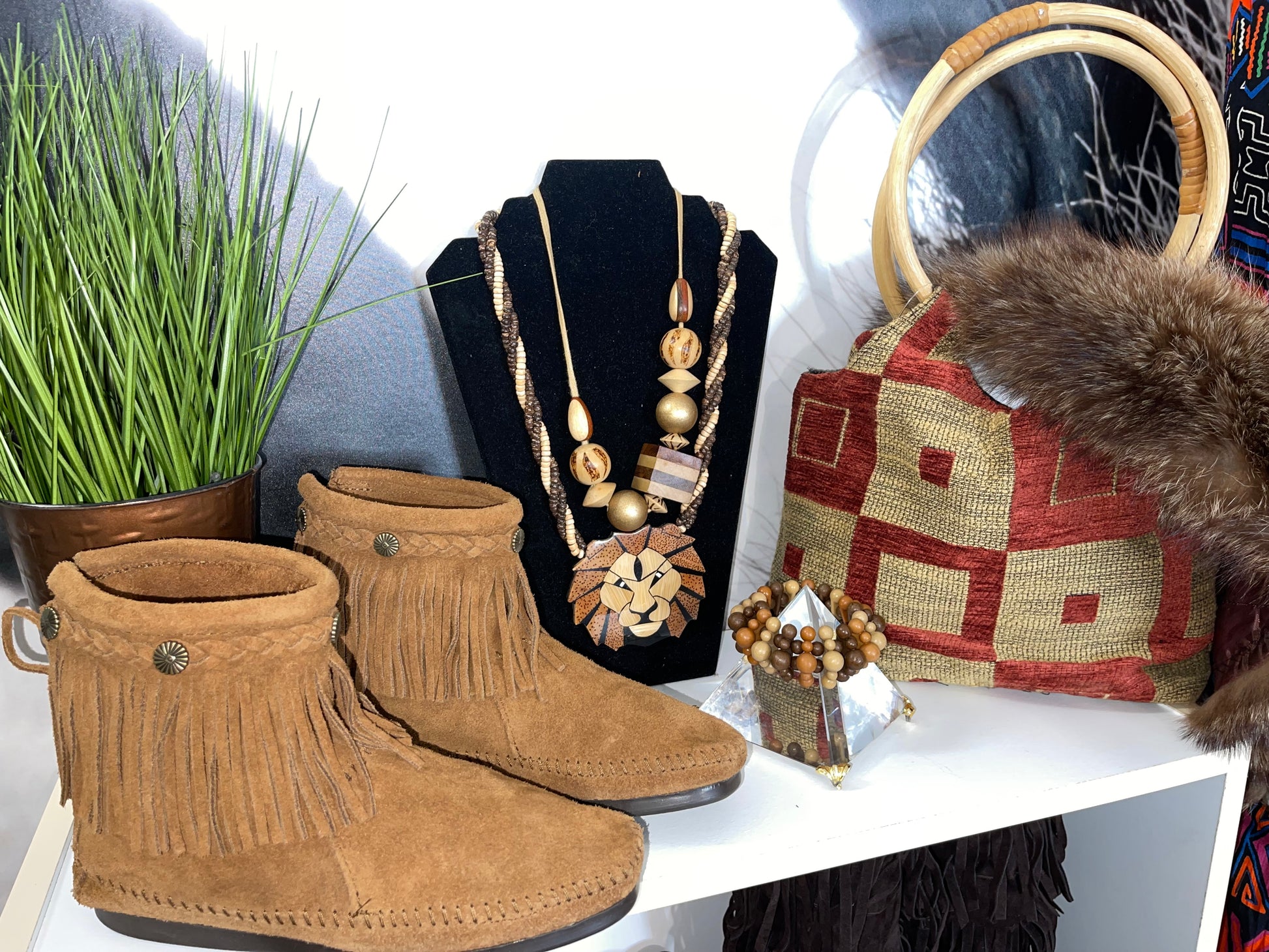 4pc Wooden jewelry set. Comes with 2 necklace, bracelet, signed Monet, Vntg earrings!