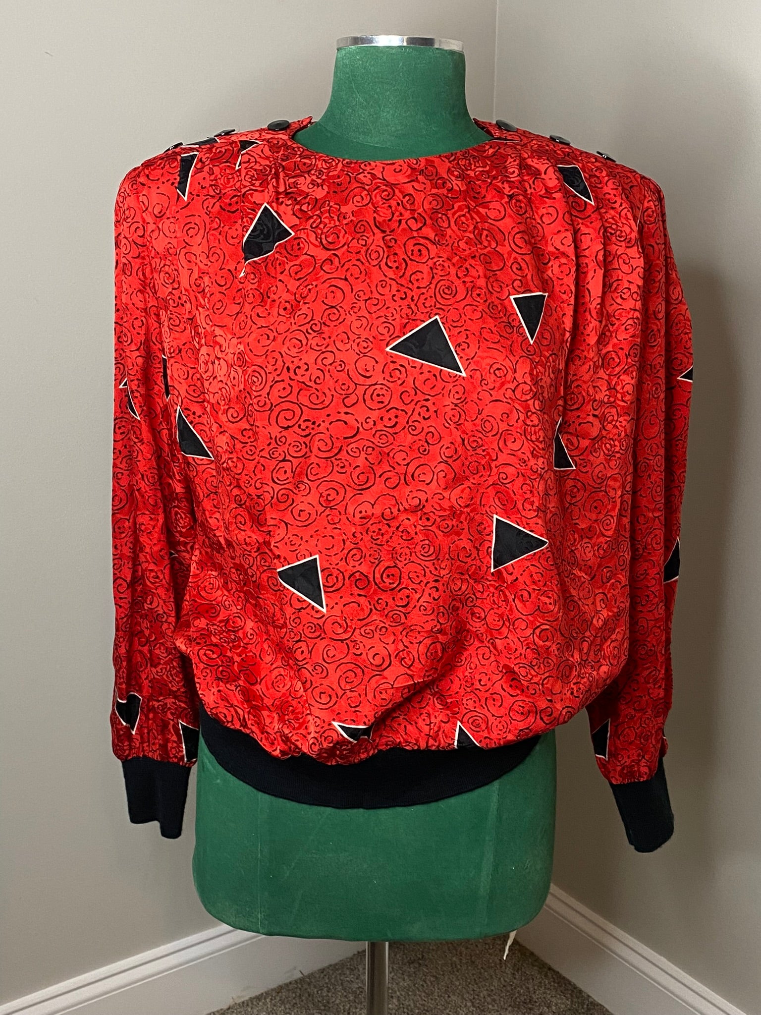 Vntg. Adrianna Papell Red Abstract Blouse with black triangle detail print. Shiny black button shoulder detail with pleated structure. 100% silk
