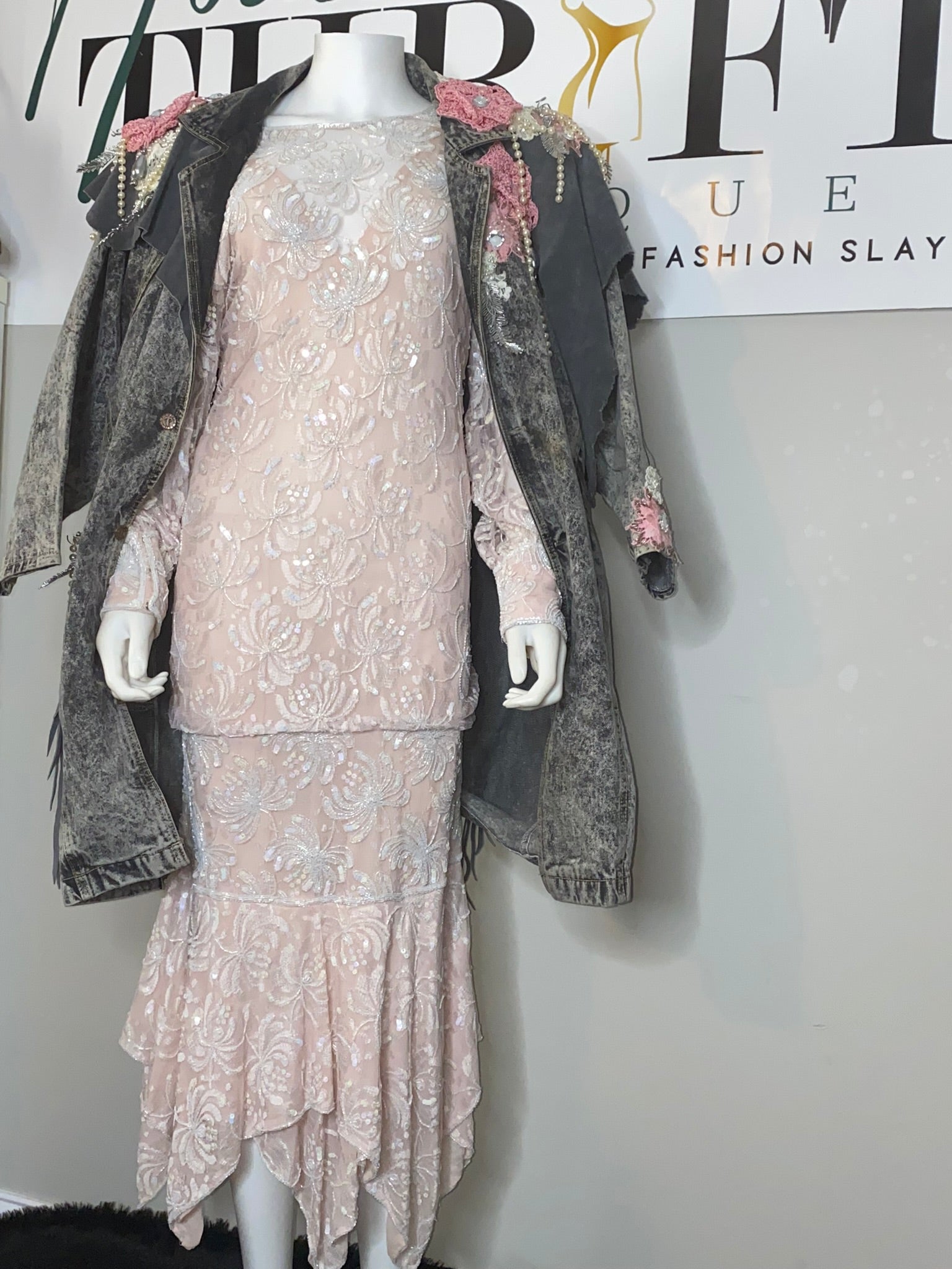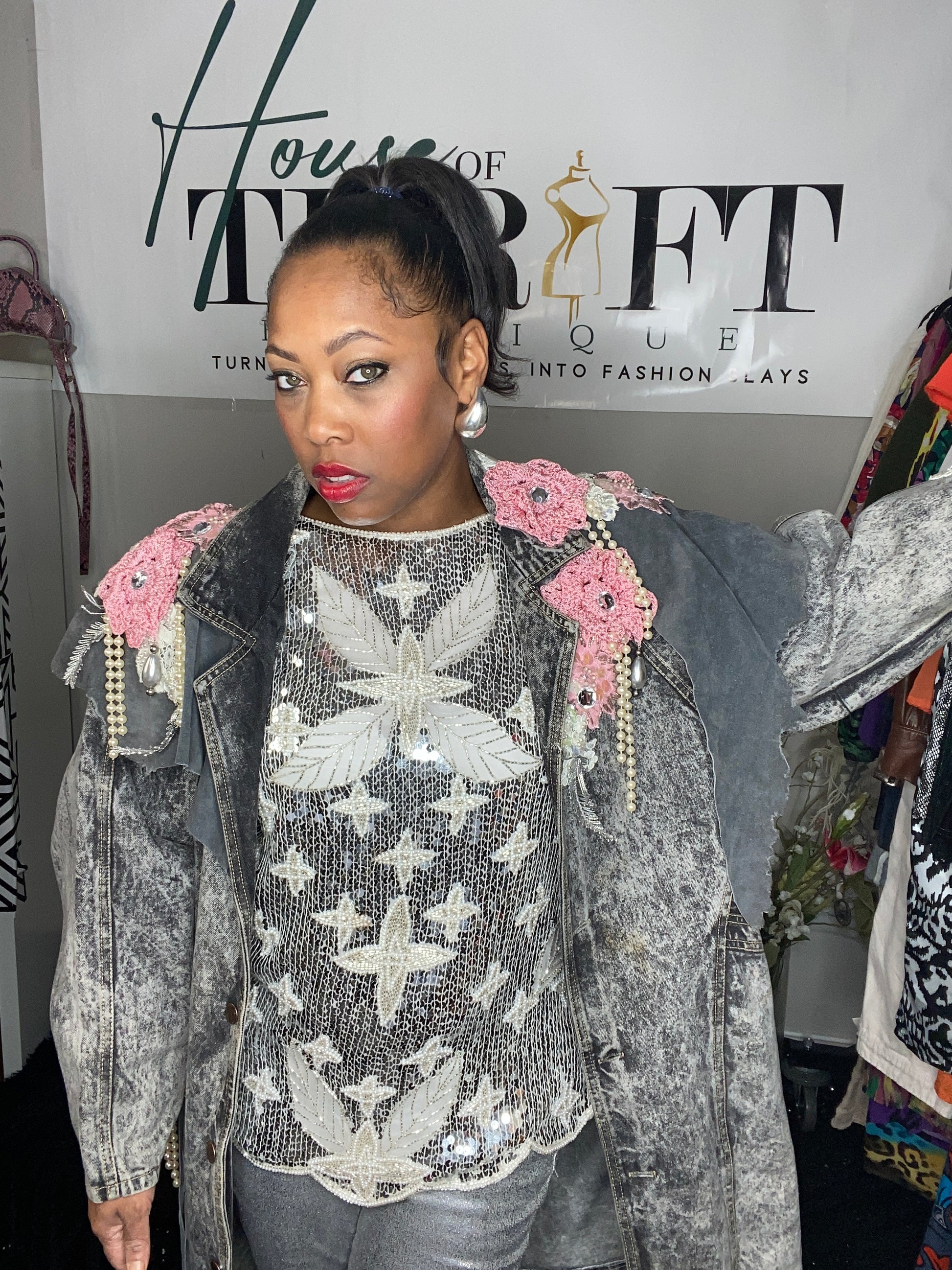 Custom denim street wear jacket. Vintage Black ash wash color denim with a grey leather accent finished with a faux fringe pearl detail and pink flower overlays. Is a vintage style cut, wide bust to slim cut dropping under knee. Great arm space.