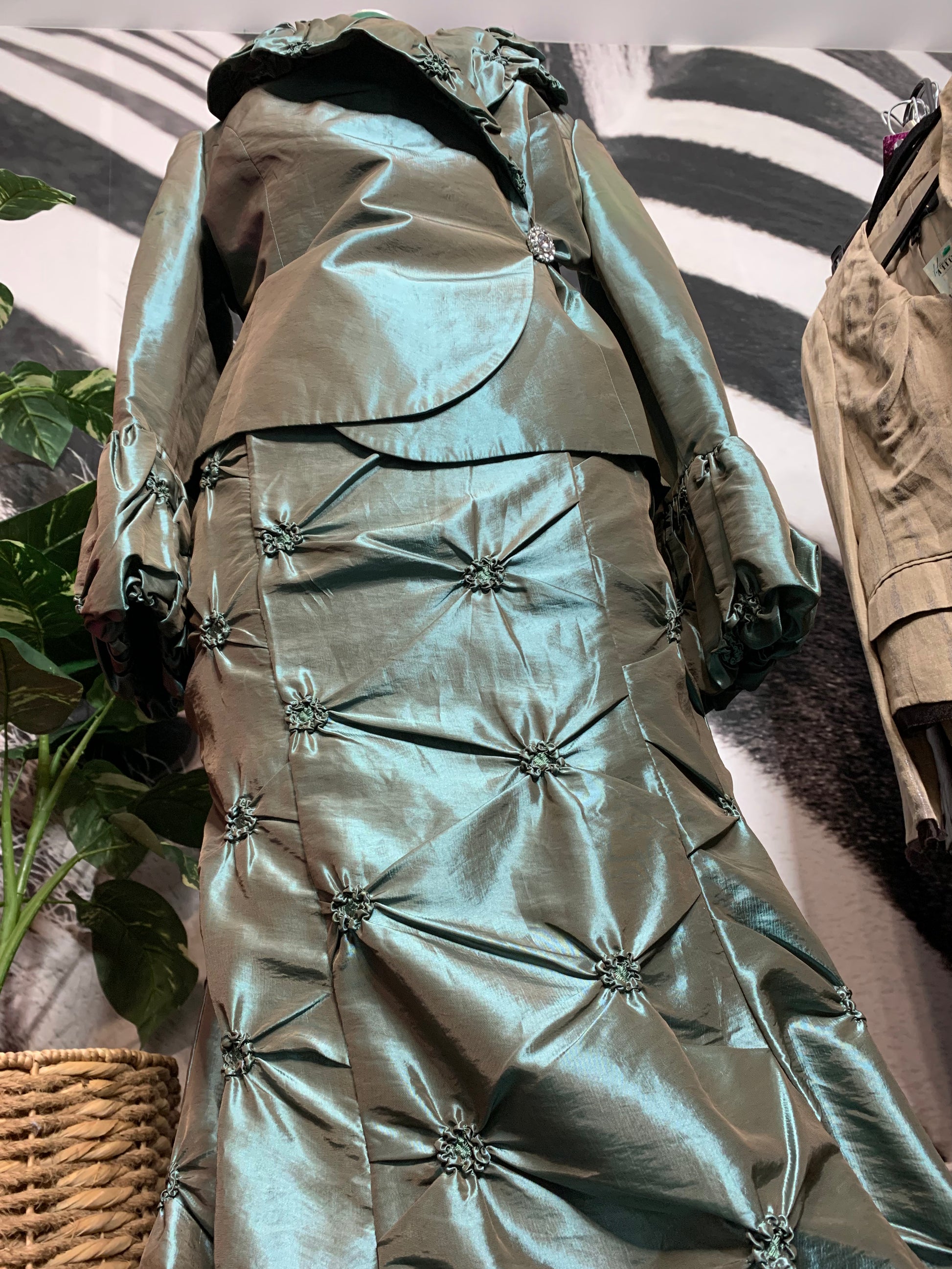 Dresses By Nubiano. Elegant silver blue below knee dress with jacket. Oversize lapel with bling detail button.