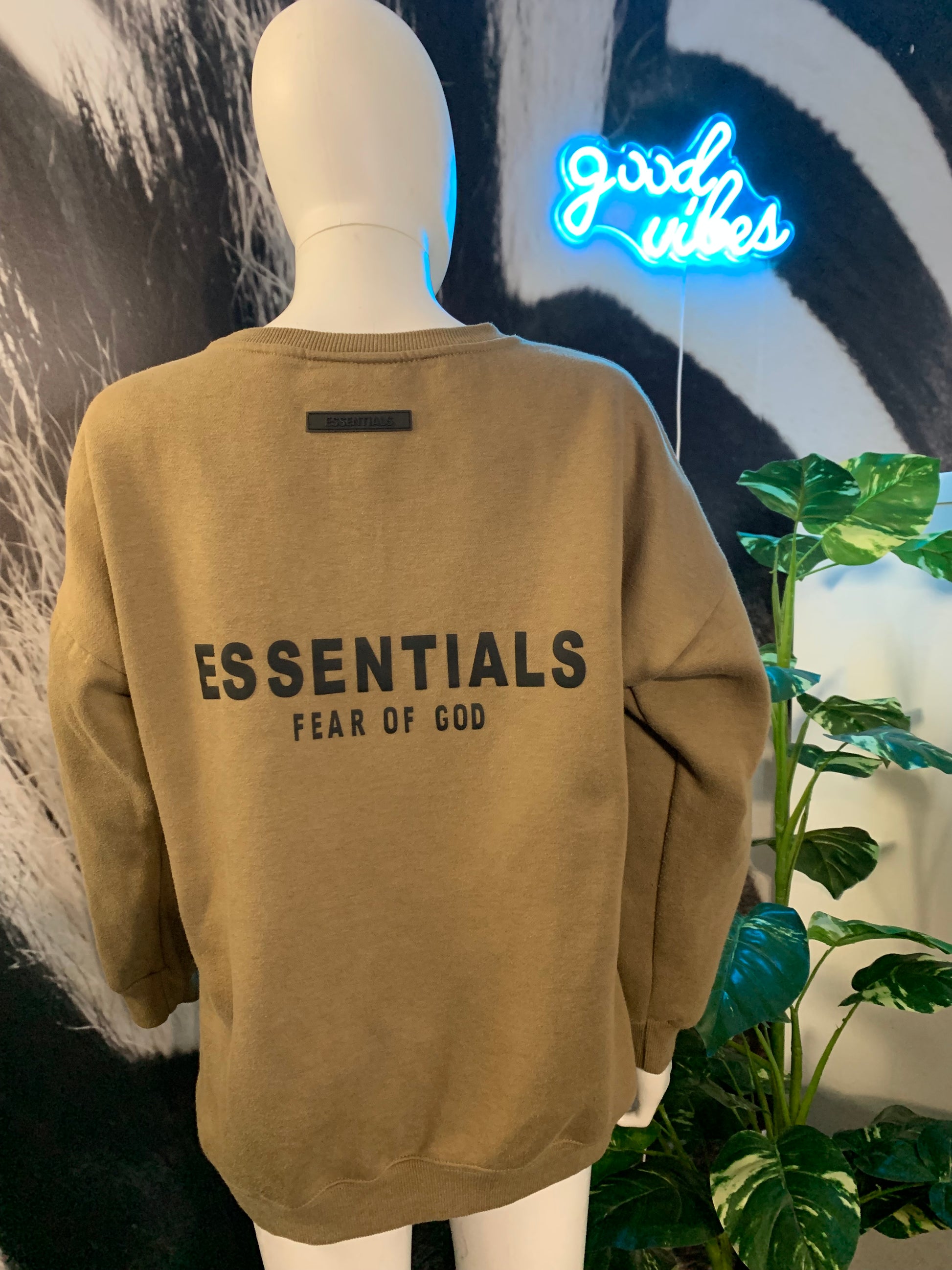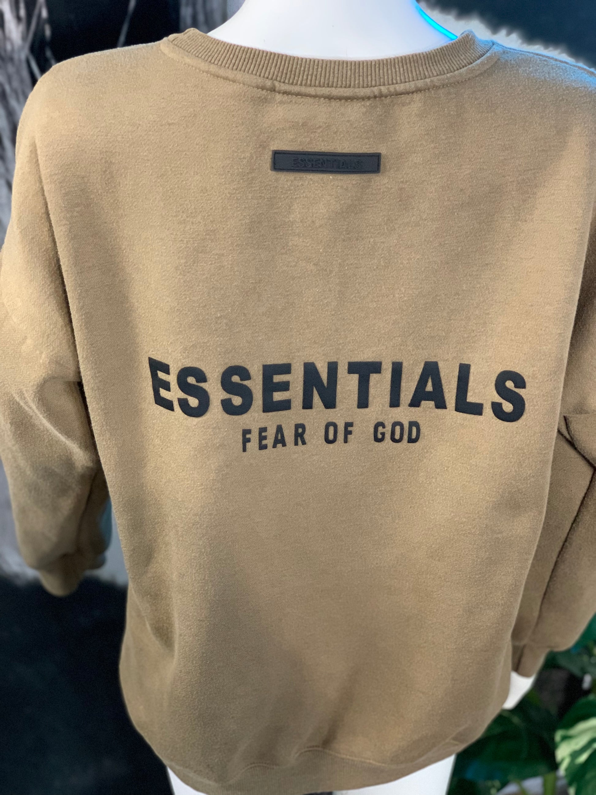 Fear of God ESSENTIALS Classic Fit Fleece Crew Neck Sweatshirt. Olive Green in color. %100 cotton
