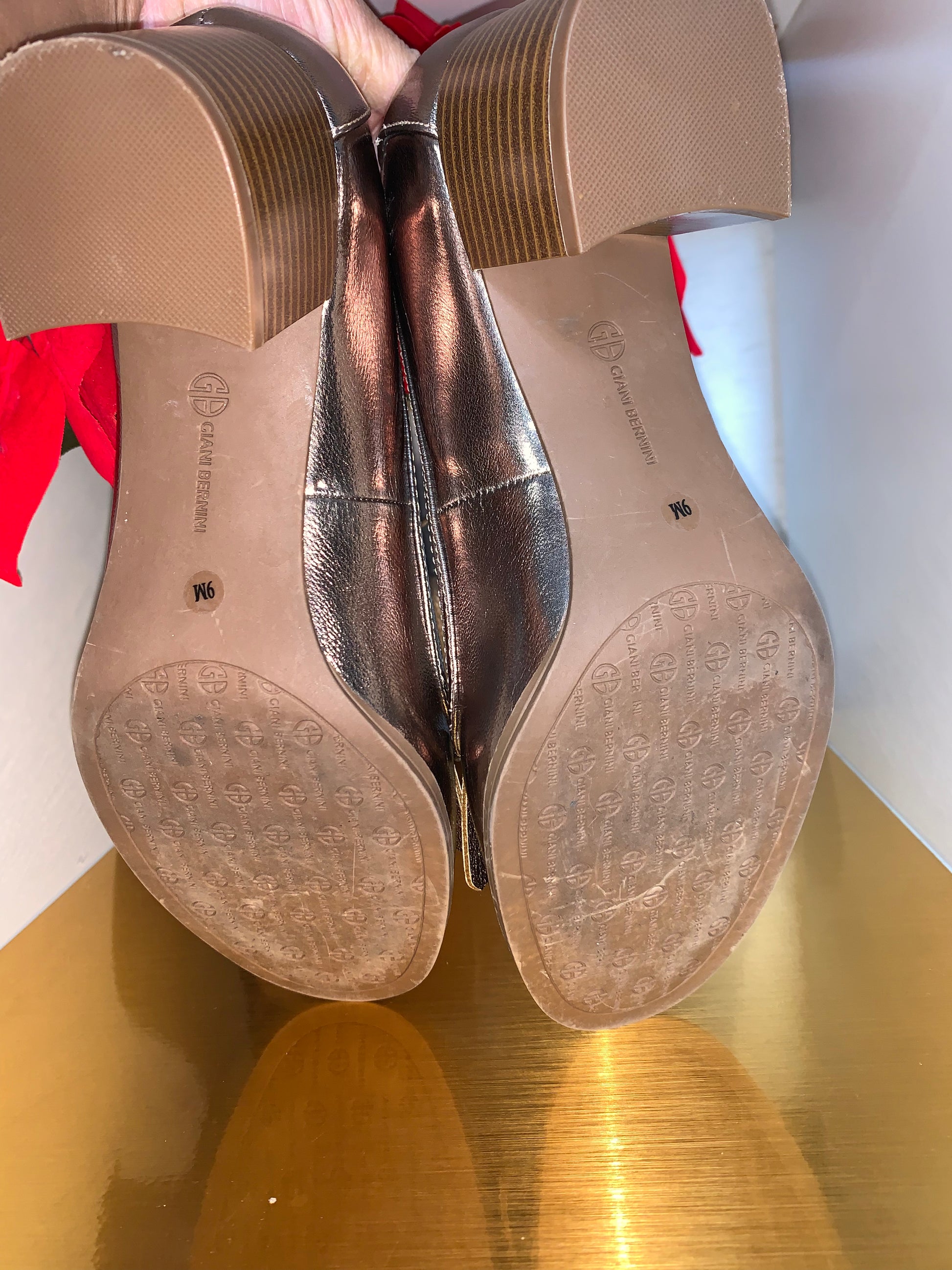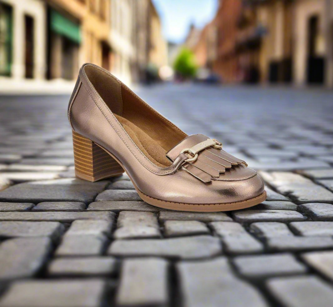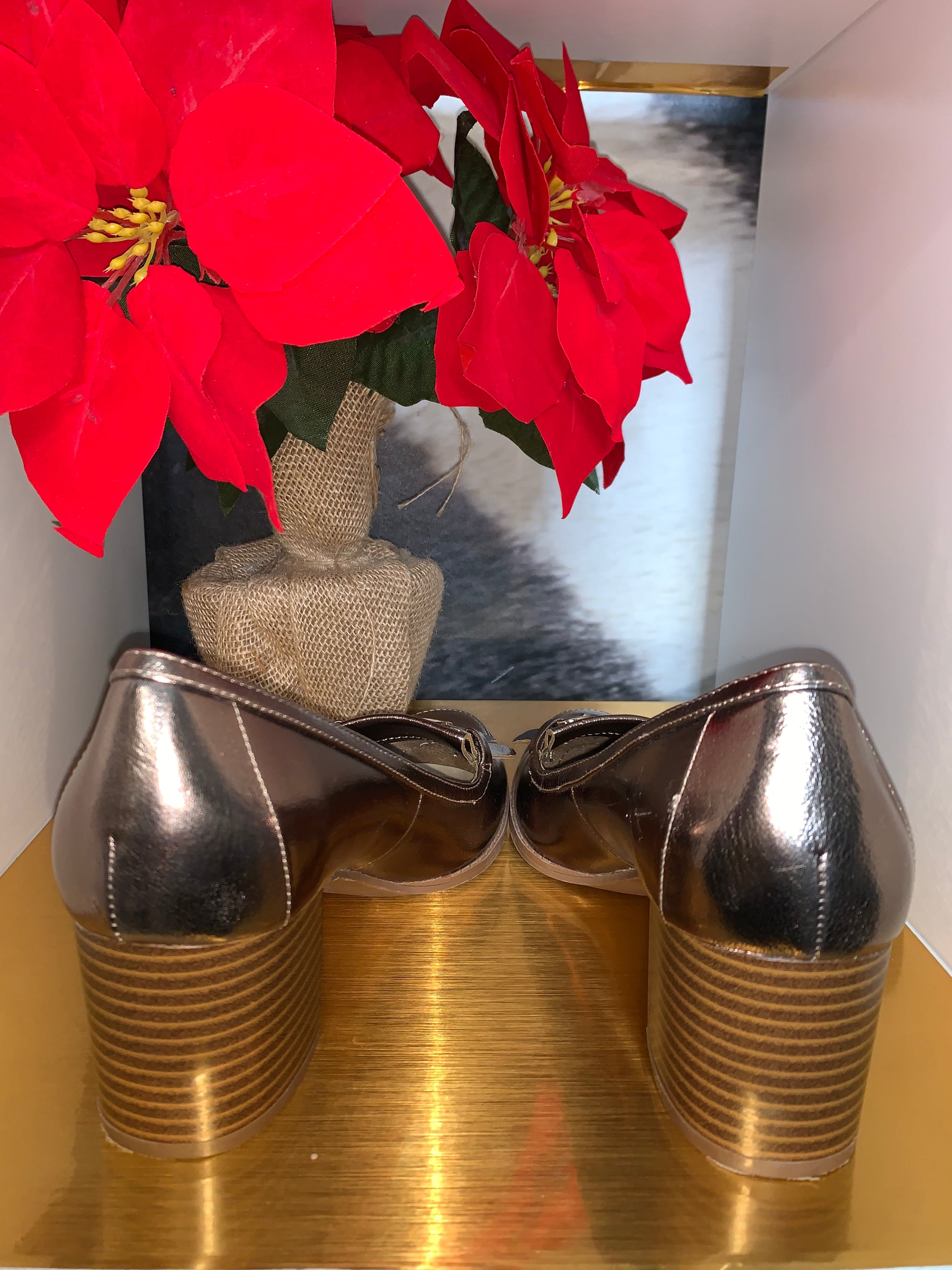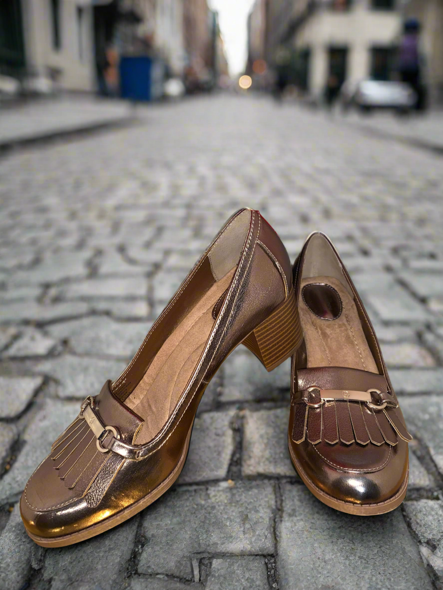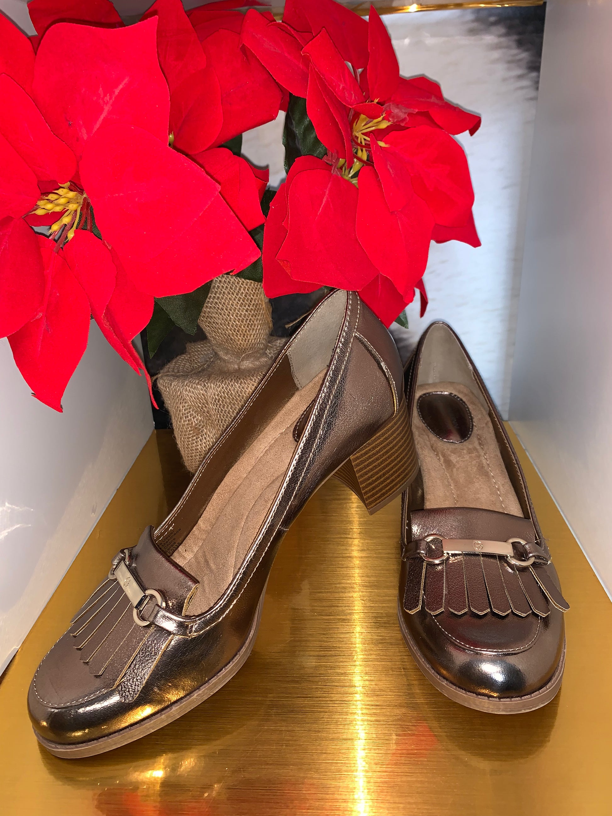 Giani Bernini seraa closes tor loffer pump. Gold tone Metallic. 2" block heel with foot molding memory foam sock with extra cushion at the heel. Has natural arch support for day-to-night stability.