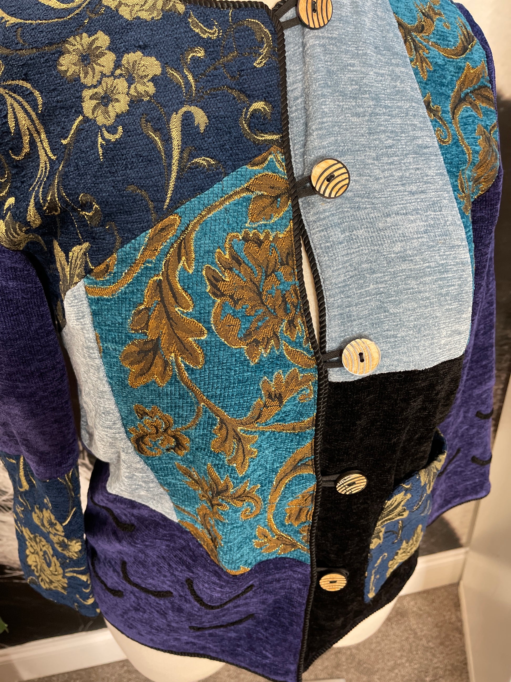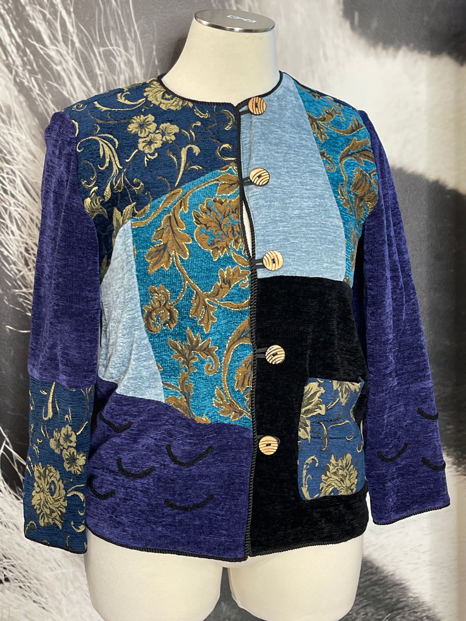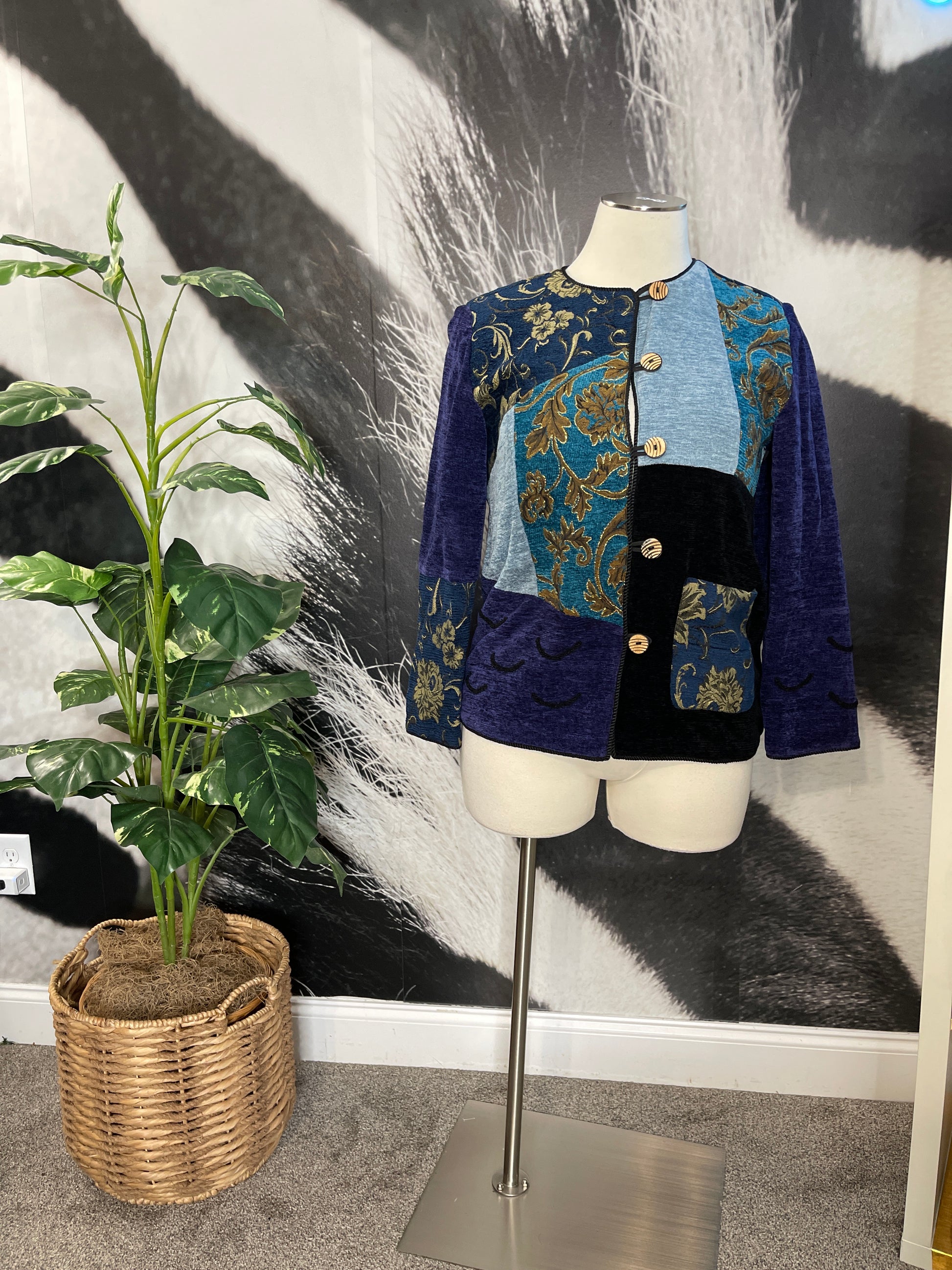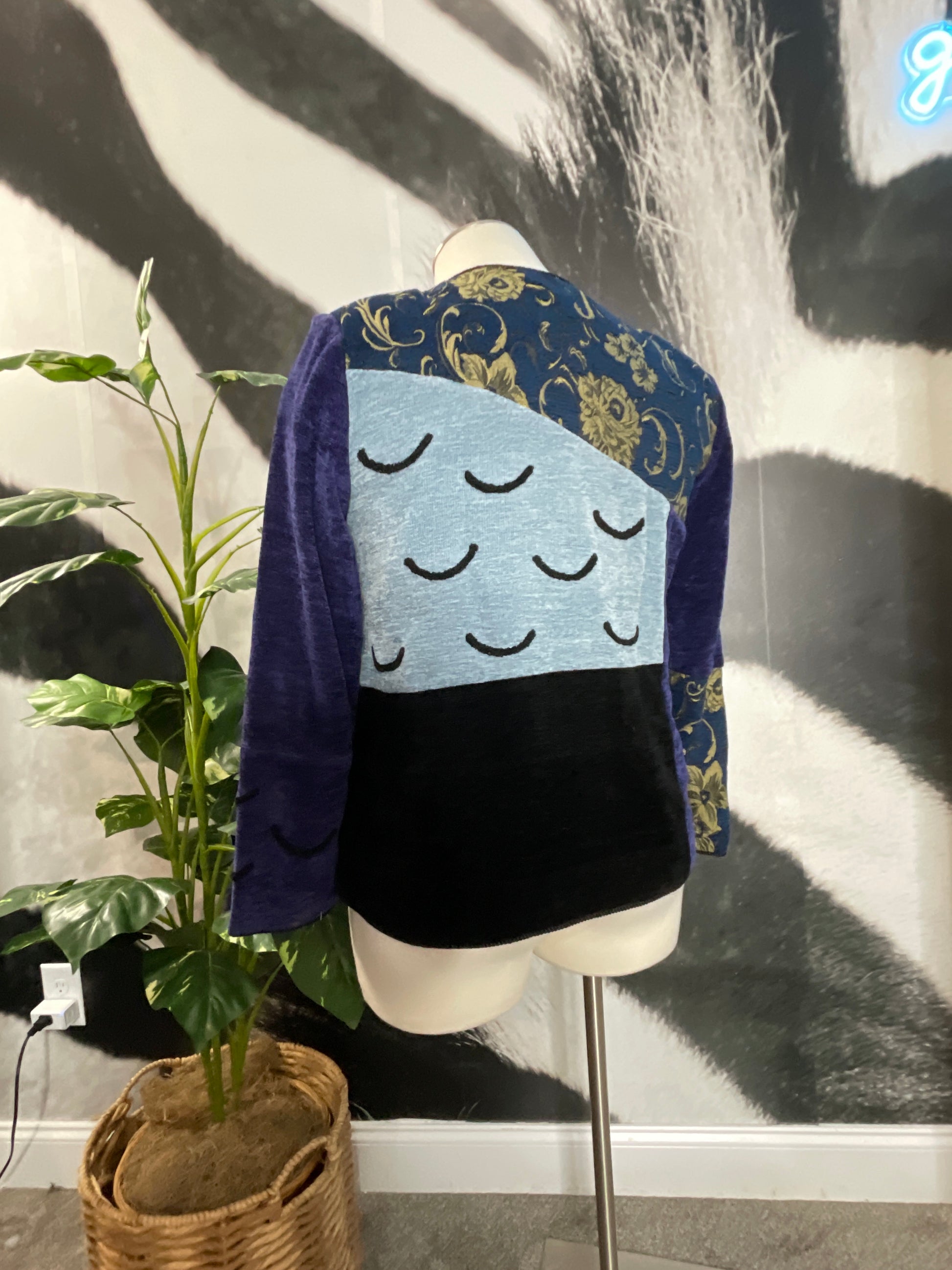 By Indigo Moon. Ocean blue embroidery overlay. Oversize button details.