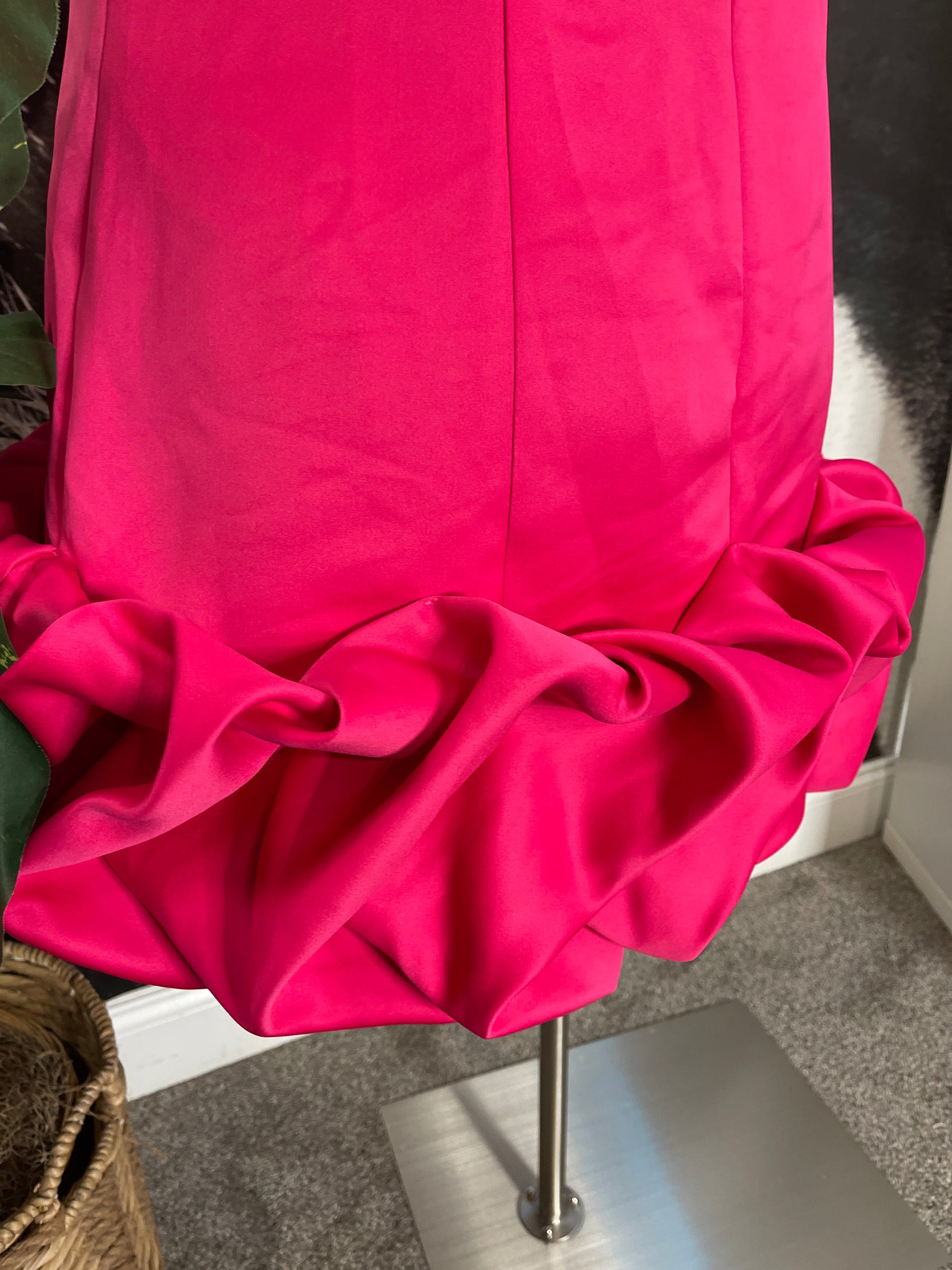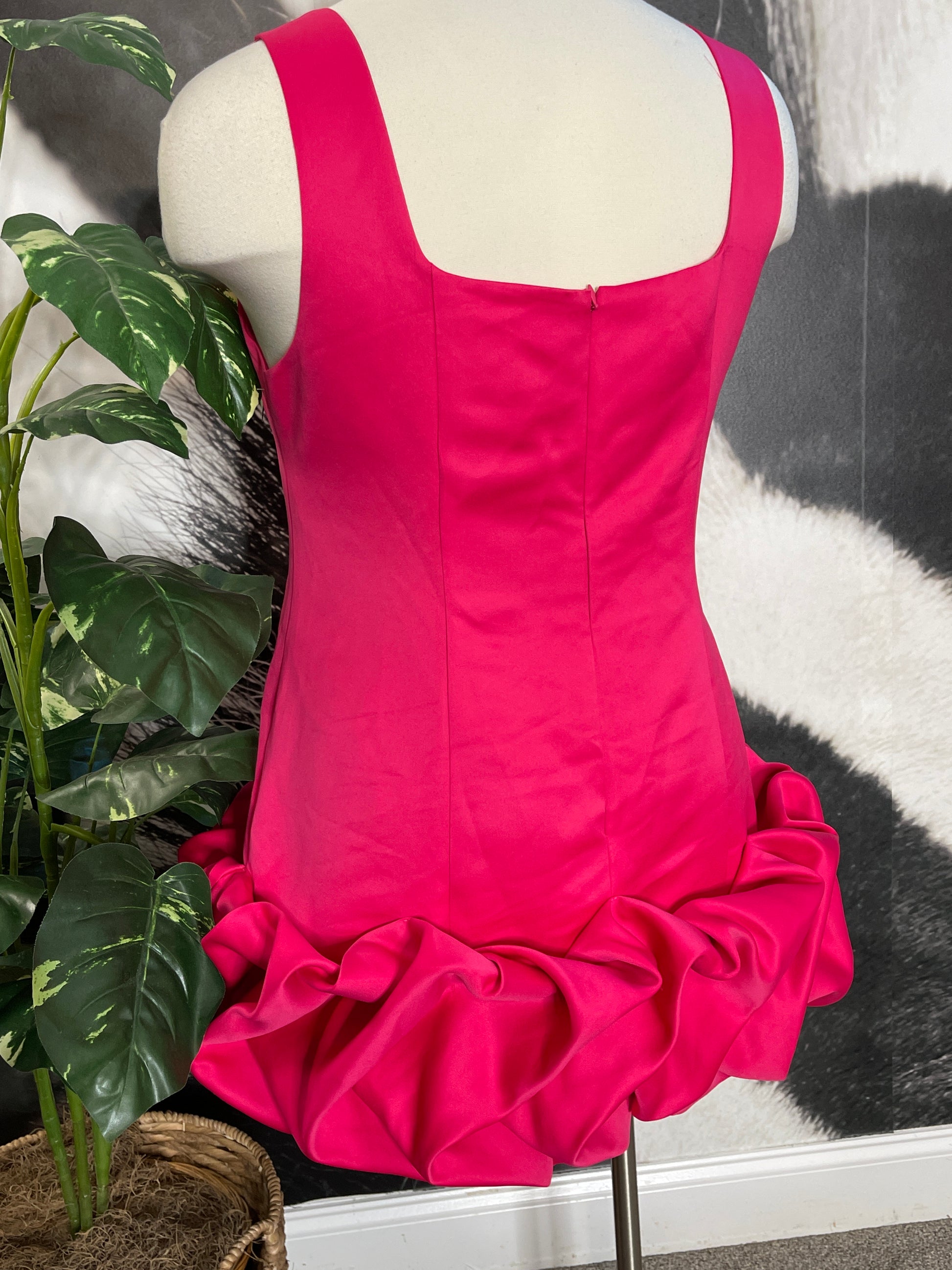 By: Fashion Nova. Pink ruffle hem dress. Cocktail dress exposed zipper closure.