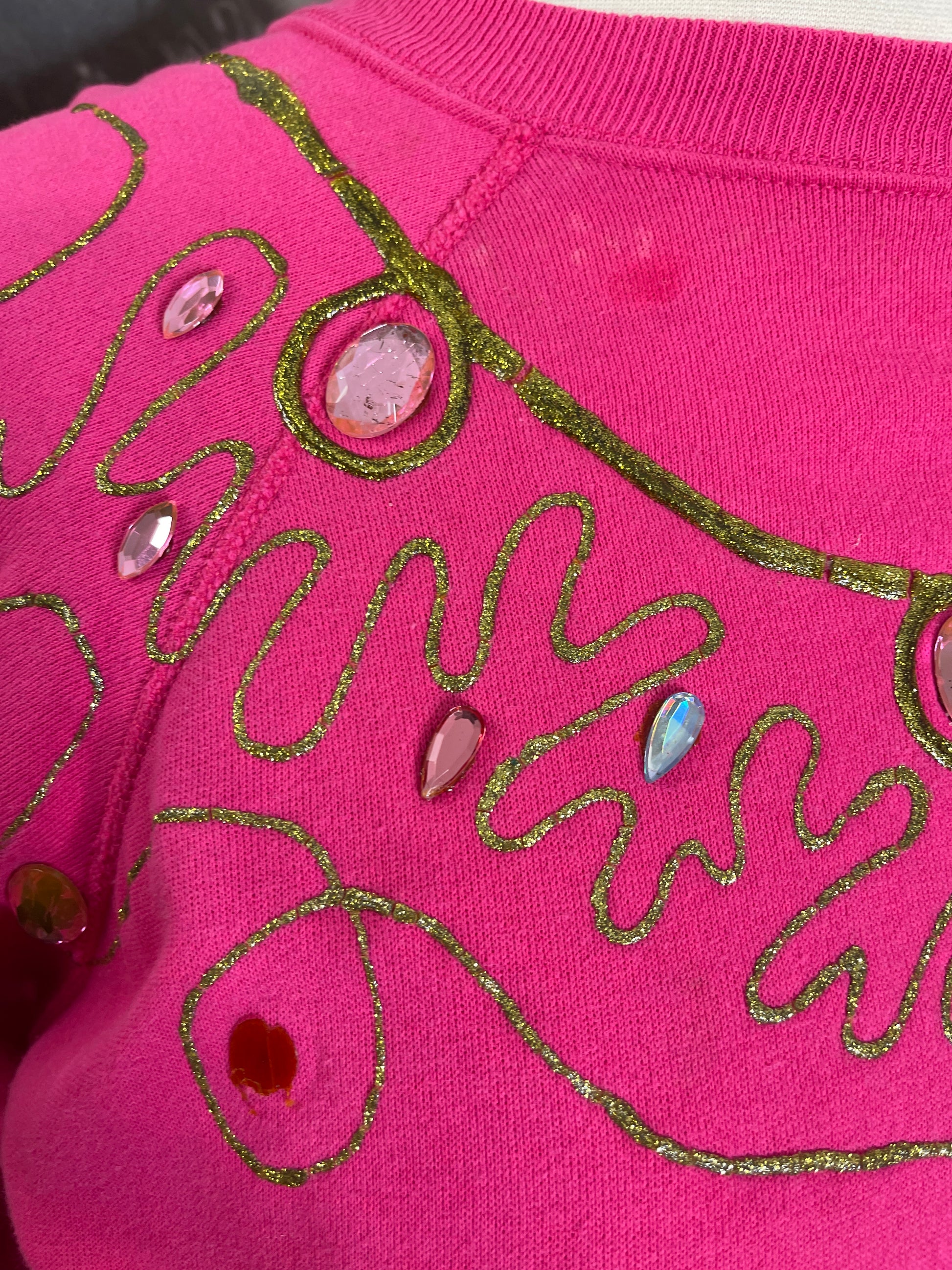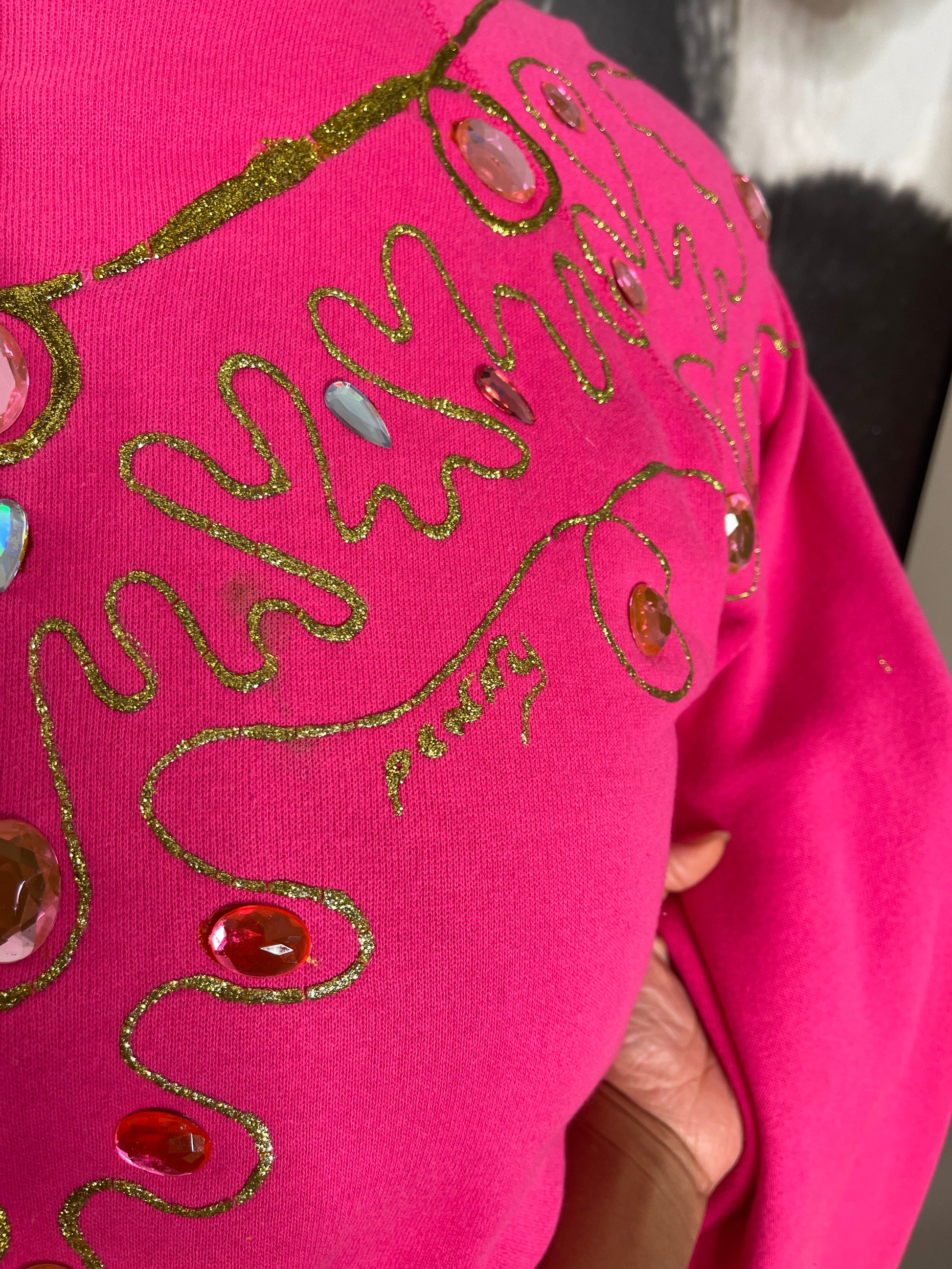 Pink gem stone sweater. Brand Original Parnell. Imperfections in pics. Missing stone, color imperfections.