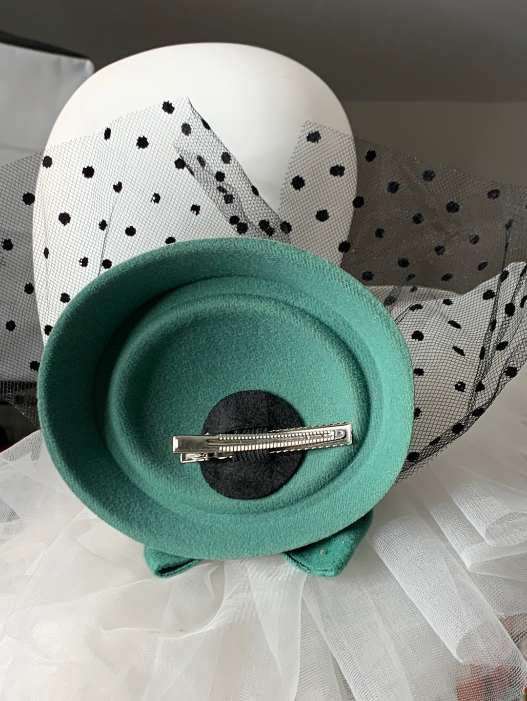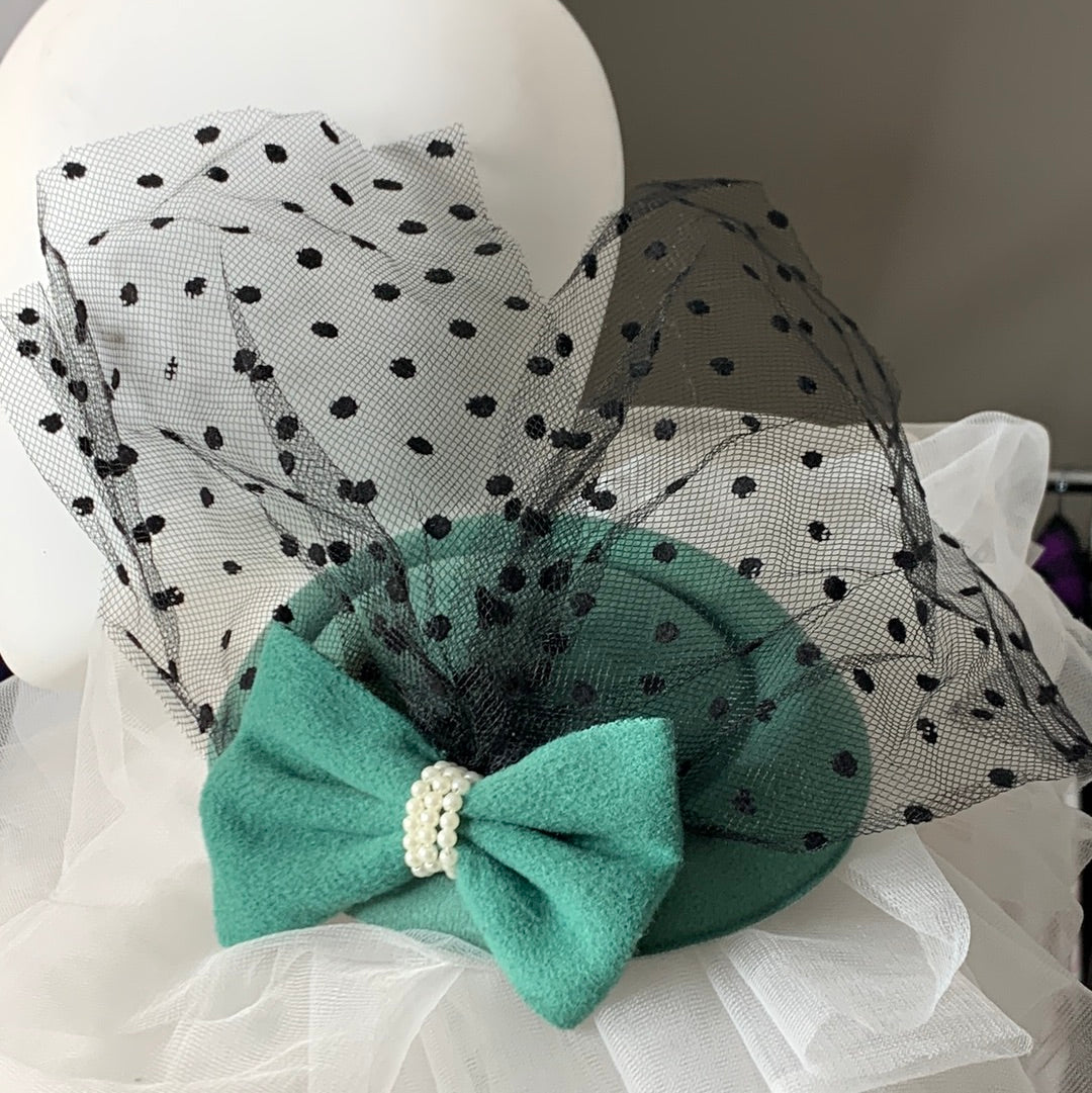Elegant Vntg. fascinator in mint green color. Light weight faux pearl bow detail. polkd dot lace tulle layer.